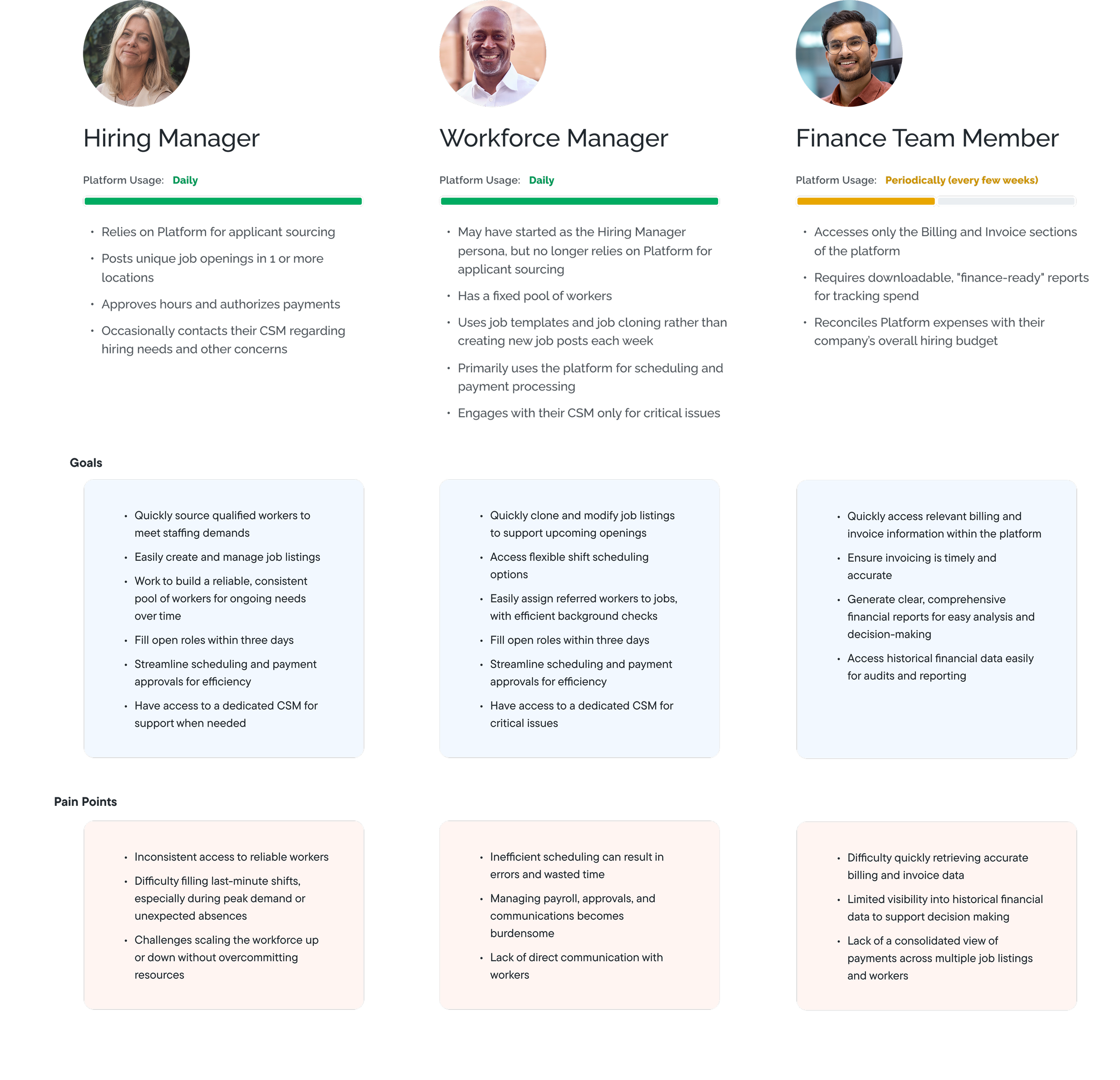 We interviewed Hiring Managers from across industries that were current users of the platform who managed warehouse, events, hospitality, manufacturing, etc to understand all the different kind of needs they may have specific to their industry.