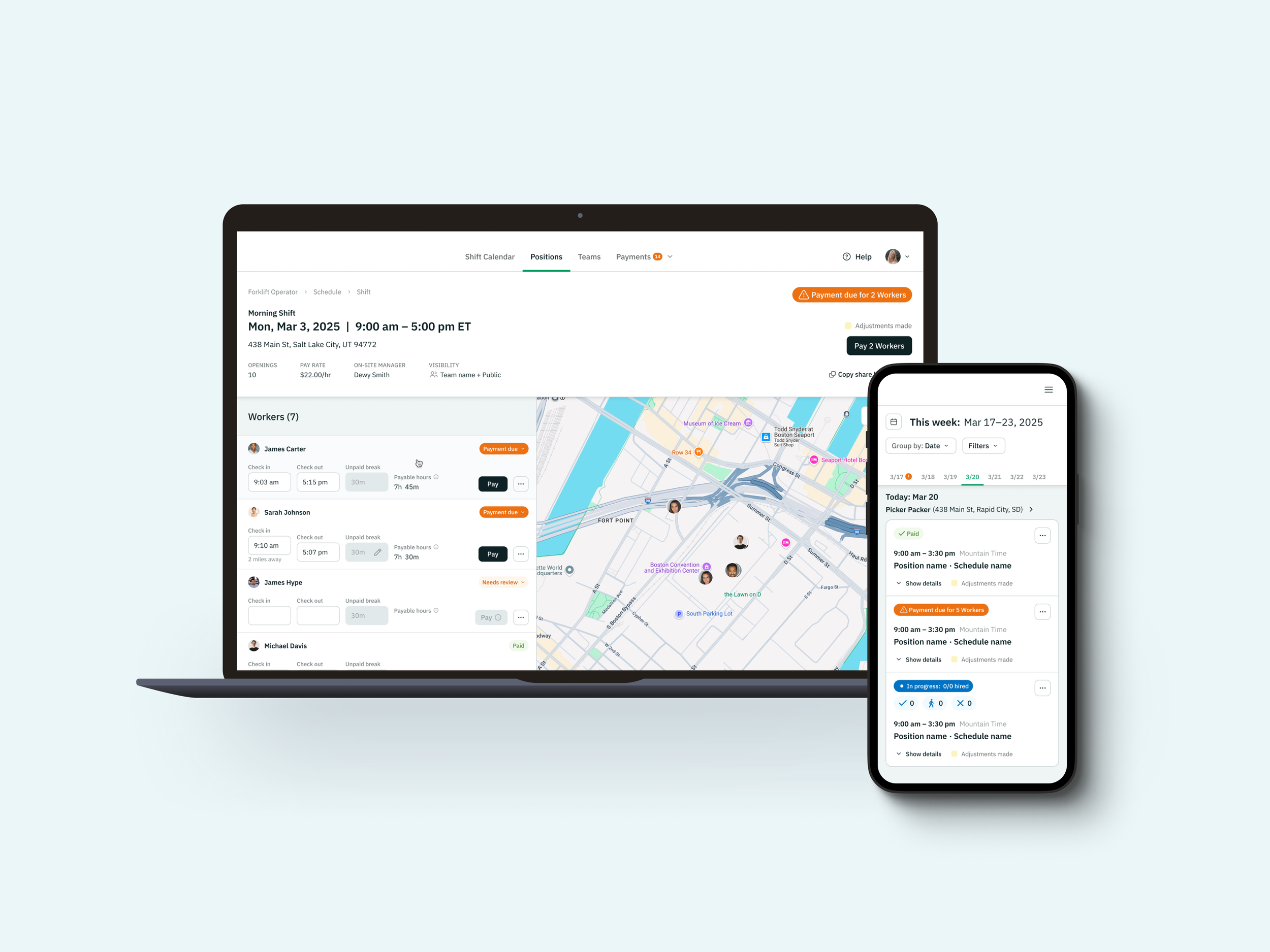 During a live shift, managers see each Worker’s check-in status alongside a map that pins their exact location, making it simple to spot who has arrived, who is en route, and who has not checked in. After the shift ends, the same screen switches to an editable table that highlights missing or incorrect hours. Managers can adjust times in line, review payable hours instantly, and trigger payment with a single click, ensuring accurate payroll without chasing Workers for updates.