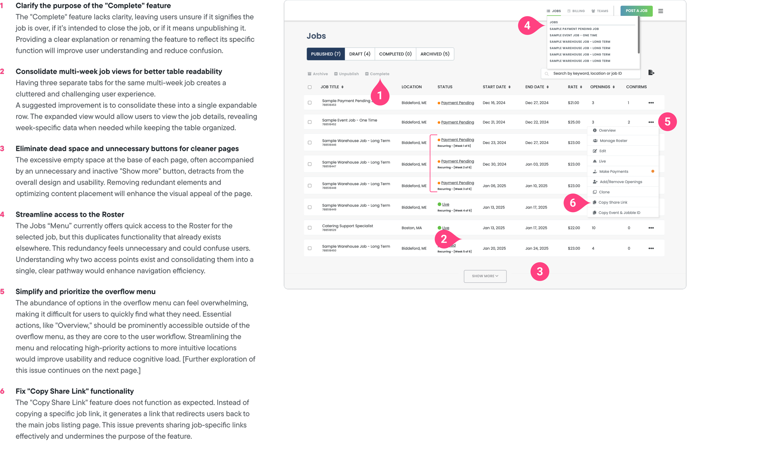 Critical actions were buried in an overcrowded overflow menu and needed to be surfaced - and the share-link tool generated generic URLs instead of job-specific links.